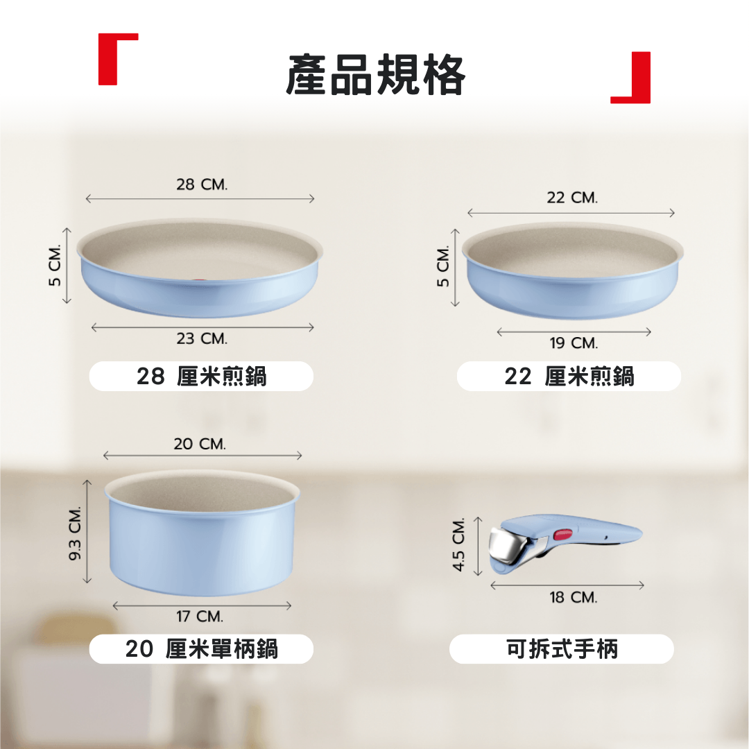 4件裝包括: 20厘米單柄鍋,22厘米和28厘米煎鍋,可拆式手柄