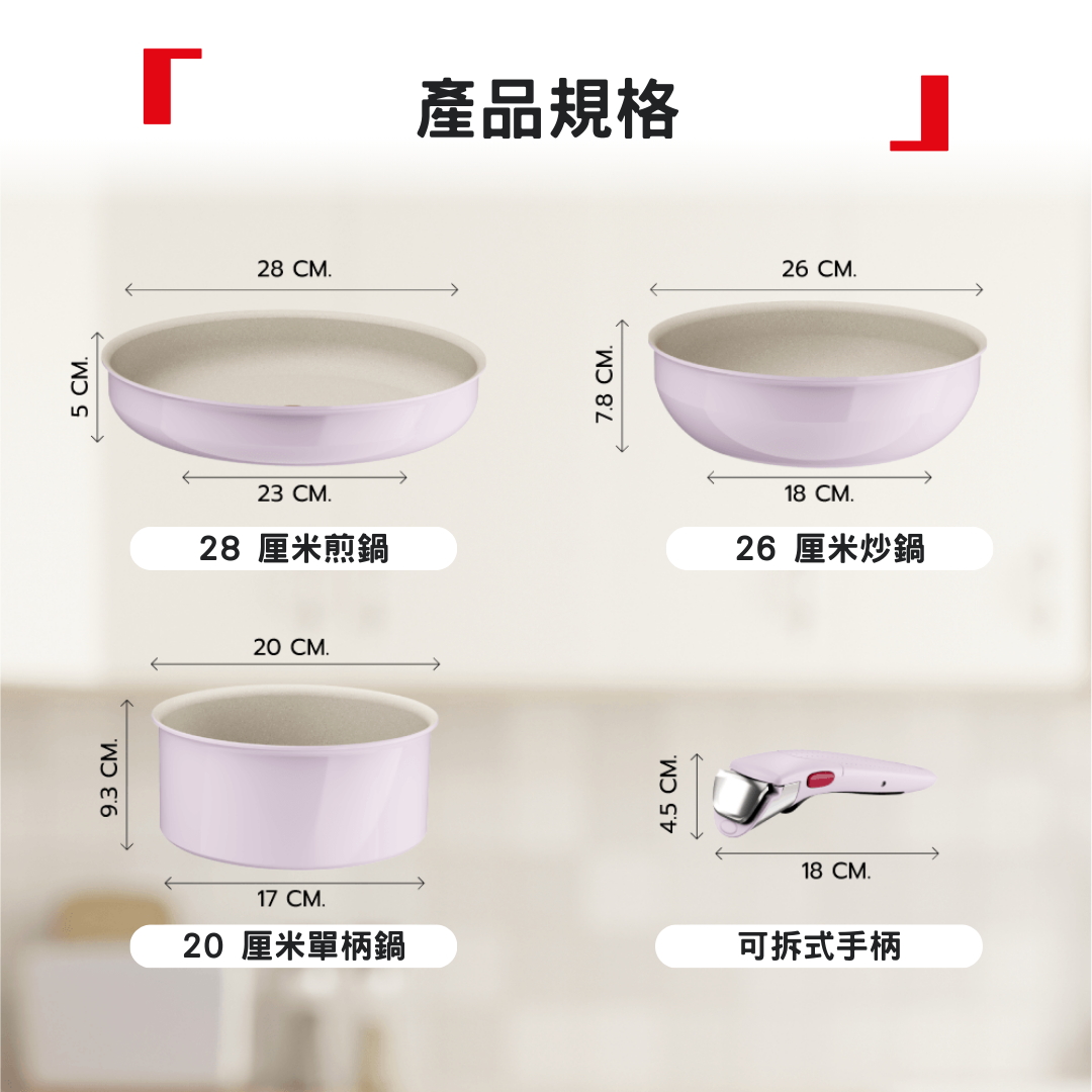 ★ 4件裝包括: 20厘米單柄鍋,26厘米炒鍋,28厘米煎鍋,可拆式手柄