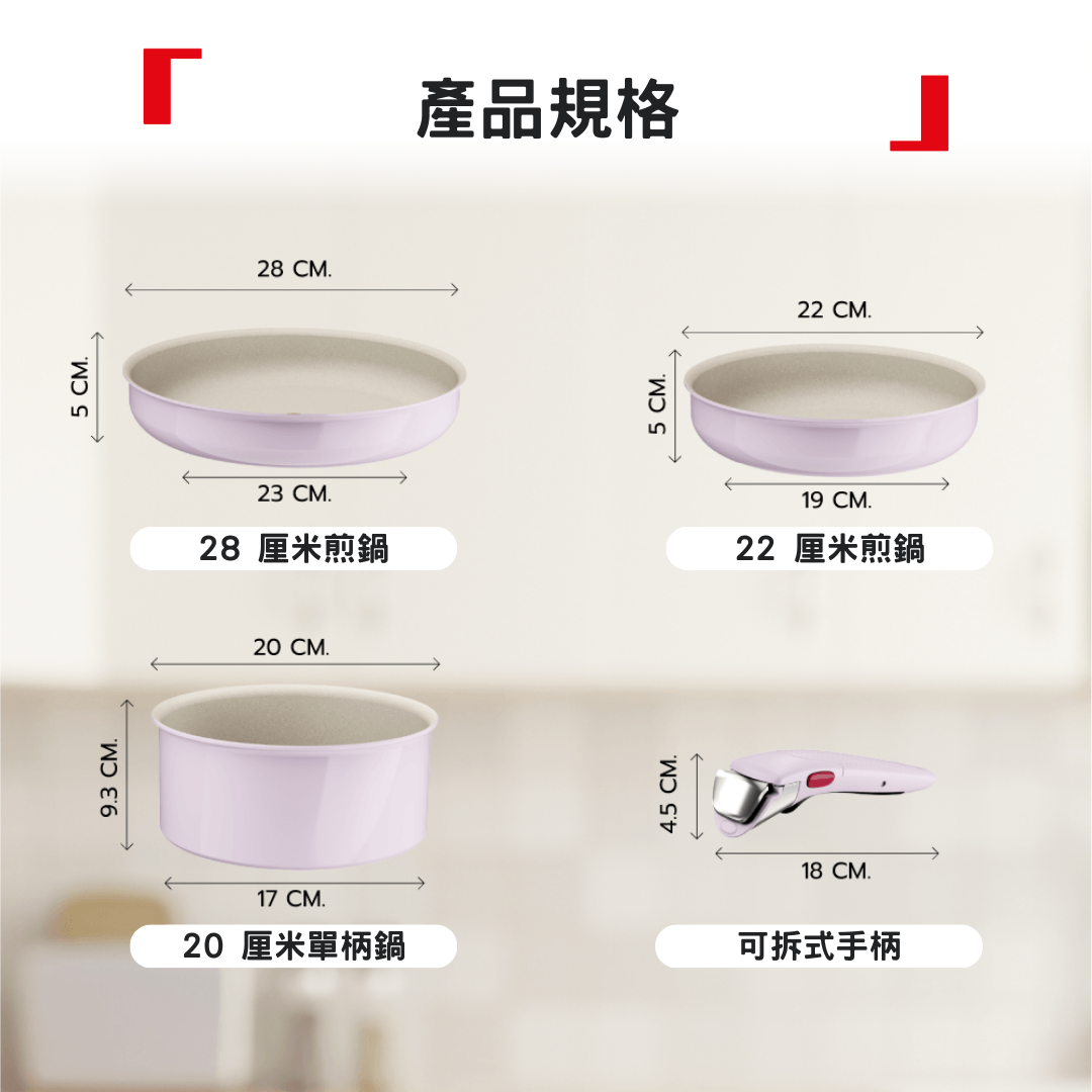 ★ 4件裝包括: 20厘米單柄鍋,22厘米和28厘米煎鍋,可拆式手柄